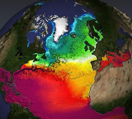 Verblüffenderweise hat sich trotz fortschreitender globaler Erwärmung ein Teil des nördlichen Atlantiks in den letzten hundert Jahren abgekühlt. Diese Abkühlung sei stärker, als von den Computermodellen errechnet. Der Rückgang der Meerestemperatur südlich von Grönland liege offenbar daran, dass sich die große Umwälzströmung im Atlantik im 20. Jahrhundert deutlich abgeschwächt hat. Der Golfstrom ist Teil dieser Umwälzströmung.